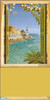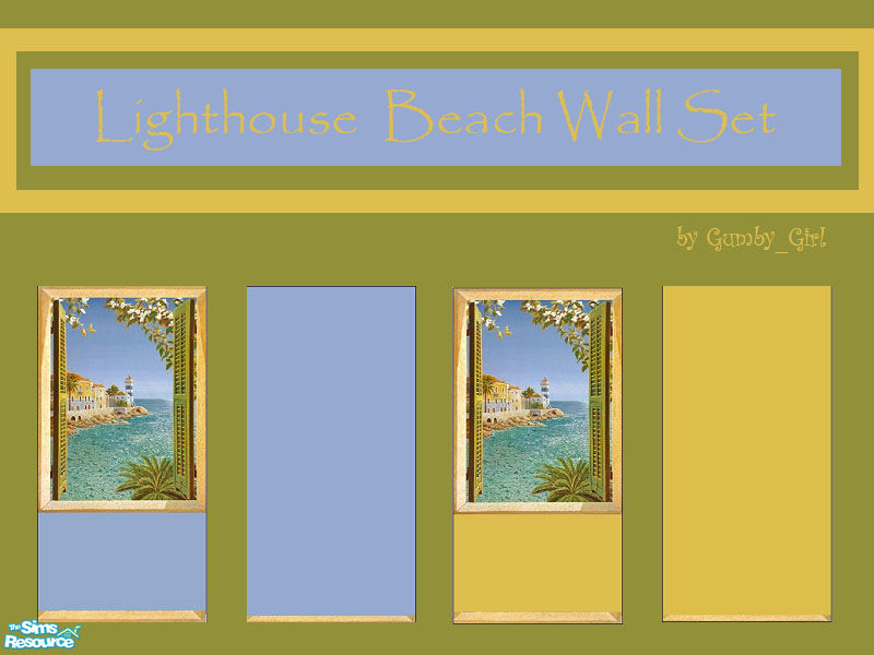 A Set of 4 Lighthouse beach mural walls. 2 x murals and 2x matching paints. Set has murals with ocean views through a window, overlooking the sea with a seaside town and lighthouse as part of the view. Also includes pale blue and sandy brown paints to match murals.