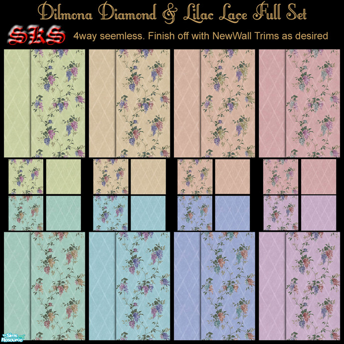 Compleate coordinate set of Dimona Diamond & Lilac Lace. Subtle bamboo diamonds for the base while vines of lilac blossoms adds a stunning effect. 4 way seemless; finish off with NewWall trims as desired. By: SKS