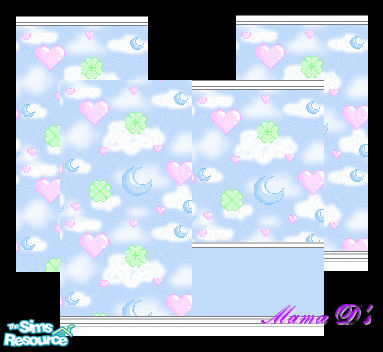 A cute wallpaper for the young female simion! Blue clouds, with hearts and, moons, and 4 leaf shamrocks. White molding. In your choice of top, bottom, double (top & bottom), and chair rail.