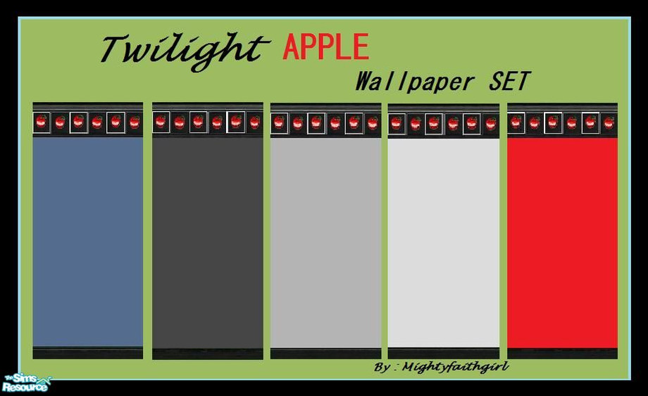 5 Wallpapers in 5 different shades encompassed top and bottom with black trim and sporting a border with the \"little red apple\" made famous from the cover of Stephanie Meyers first book in the TWILIGHT saga!Now your teen Sims can have twilight walls!