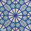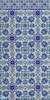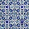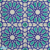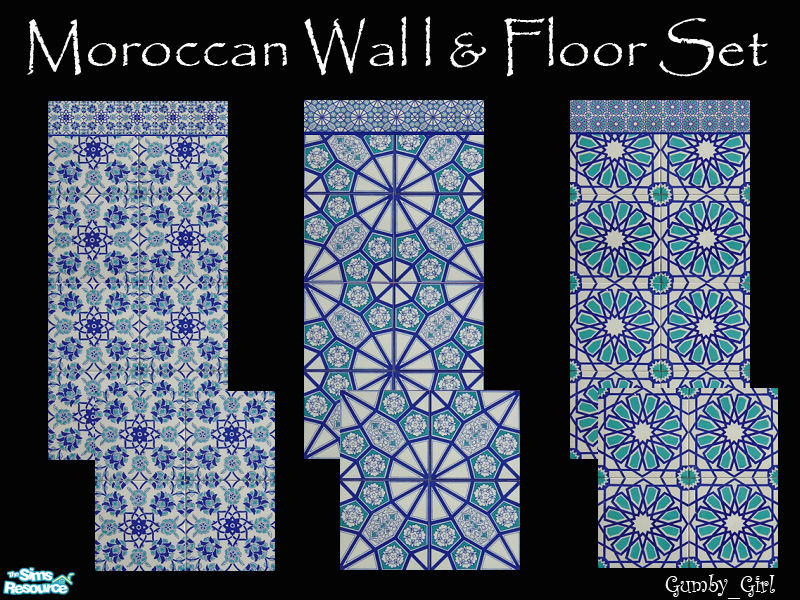 Set of three Moroccan themed tiled walls with matching tiled floors. Bright vibrant dark blue,light blue, green, aqua and white with floral motif designs.