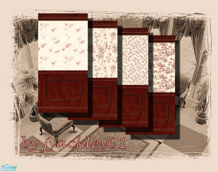 The Red Toile Wall Set contains four walls, each with a different beautiful red toile design. Each wall also features beautiful mahogany wood accents. Perfect for French-Country decor!