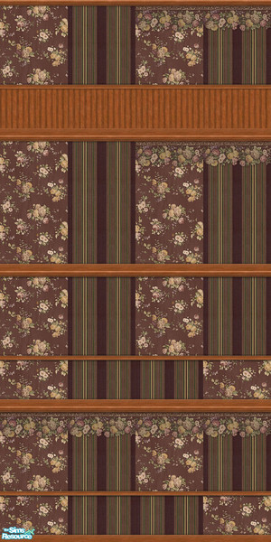 This series contains 16 walls. It consists of a floral border, a floral companion paper, and a stripe paper. The moldings are Medium Wood.