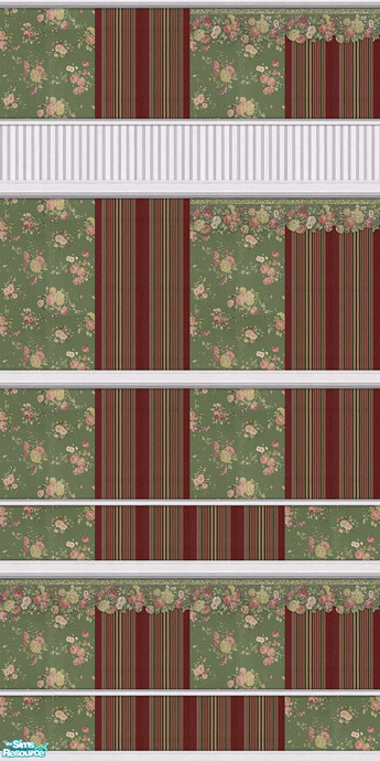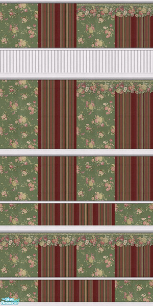 This series contains 16 walls. It consists of a floral border, a floral companion paper, and a stripe paper. The moldings are White.