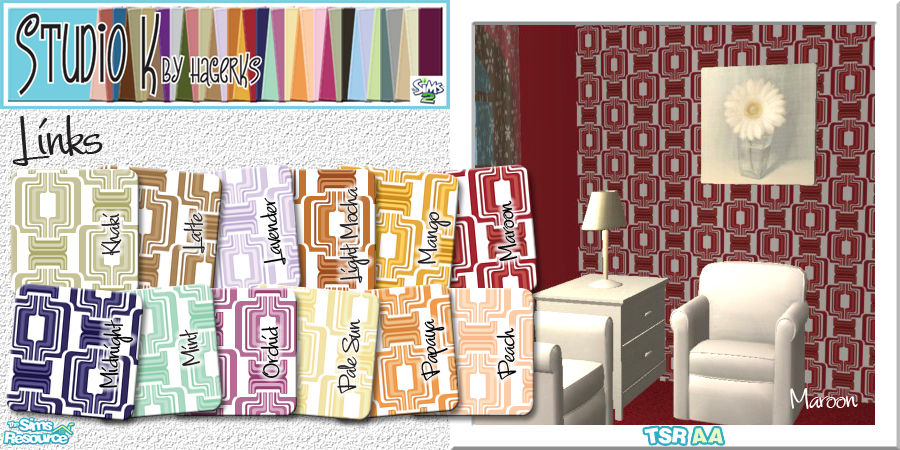 13-24 of 36 colors. Studio K Signature colors in a fun link design. Category: Wallpaper. Price: 6 simoleons. Coordinates with Studio K carpet collections and linoleum lines. Enjoy! and have an AMAZING day!