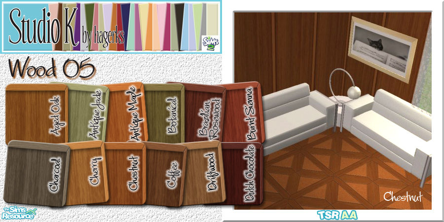 1-12 of 36 colors. Can be found under Paneling and can be purchased for 10 simoleons. Coordinates with all Studio K wood floors. Enjoy! and have an AMAZING day!