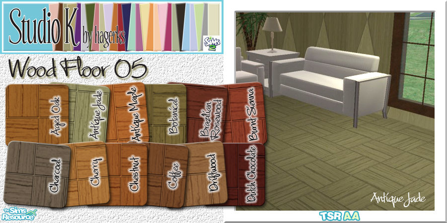 1-12 of 36 colors. Can be found under Wood and can be purchased for 5 simoleons. Coordinates with all Studio K wood (paneling) walls. Enjoy! and have an AMAZING day!