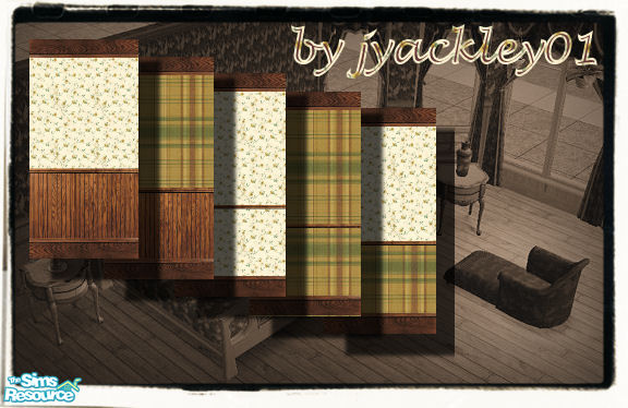 This lovely set of wallpapers features a beige paper with a quaint sunflower design or a lovely plaid design. Each wall also features vintage wainscoting and trim.