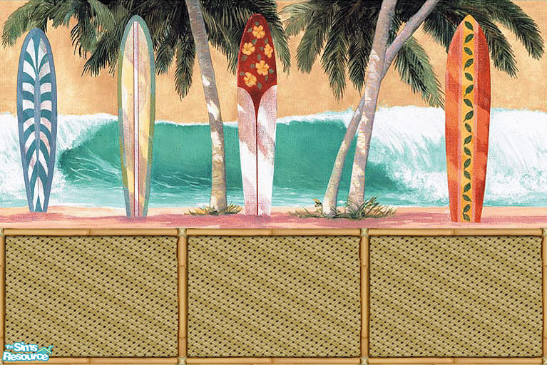 A surfing themed wallpaper mural with bamboo wainscoted paneling. This is 3 wallpapers that fit seamlessly together to create a mural. (shown in the preview pic)