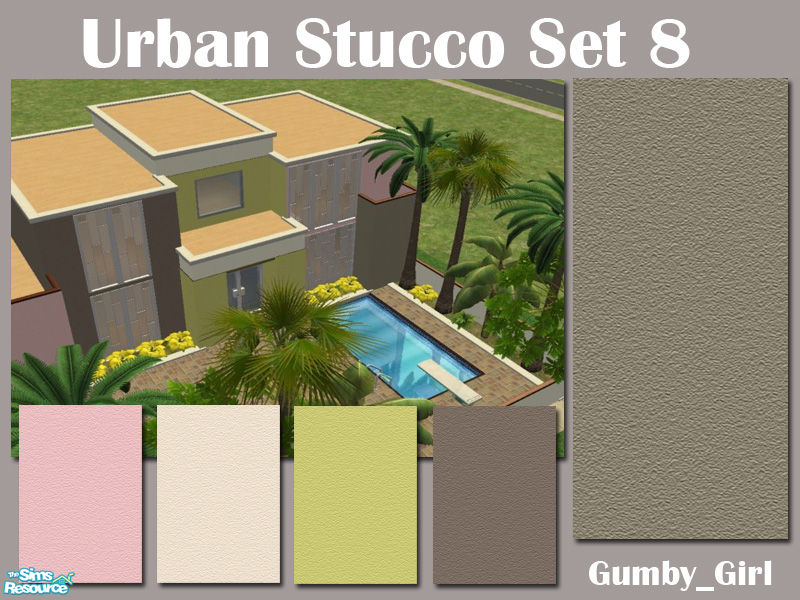 A set of 5 stucco walls for your home or office. Colours include pink, off white, lime green, dark grey and stone . Has co-ordinating paints, siding, bricks and floors coming soon. Cost $0 - great for sims wanting to decorate on a budget.