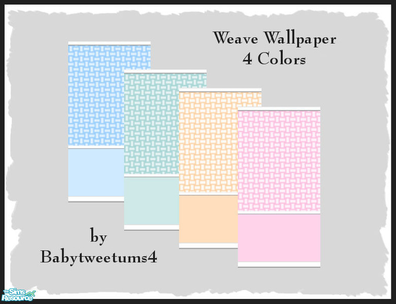 This wallpaper has a weave pattern in four colors blue, green, peach and pink. Also look for the matching carpet.