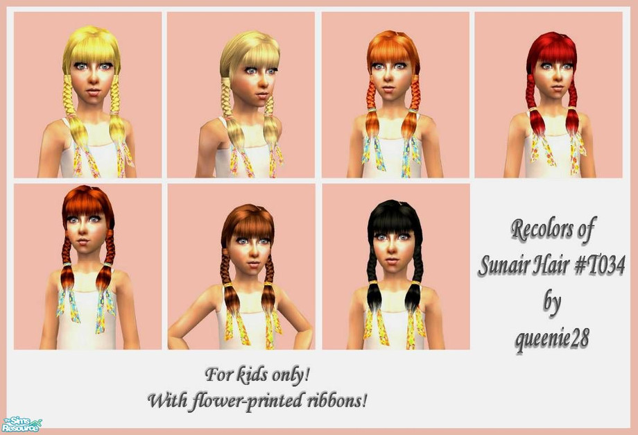 I did these colors for my cute little sim kiddies. These are recolors of Sunair #T034 mesh. 7 colors available. The ribbons have flower prints on them, perfect for little girls. Hair is binned and is available for toddler and kid ages only. Don't forget to get the mesh!(See link below) Enjoy!