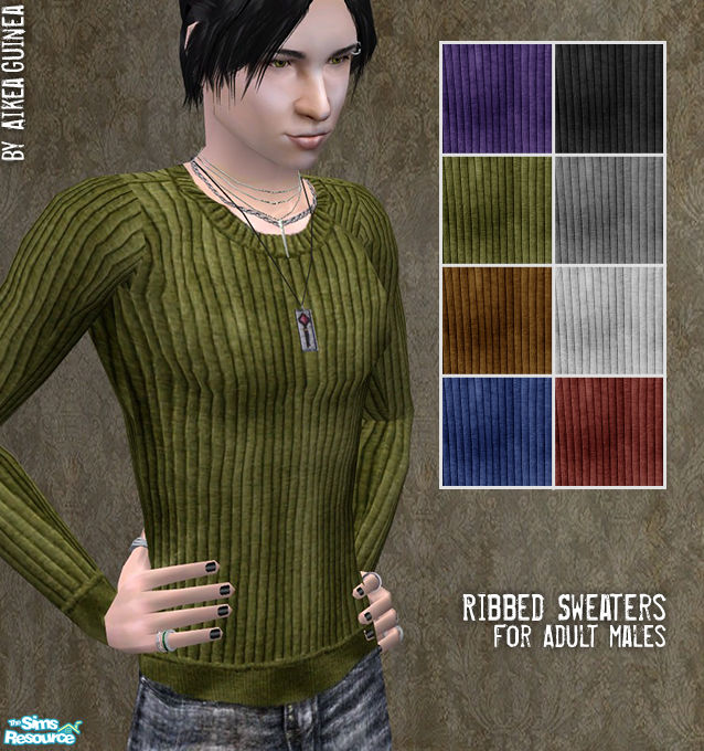 Ribbed sweaters for adult males. Set includes eight different colors. Extra long alphas allow these sweaters to be worn with \'untucked\' bottoms (as shown). Base game compatible, no mesh required.