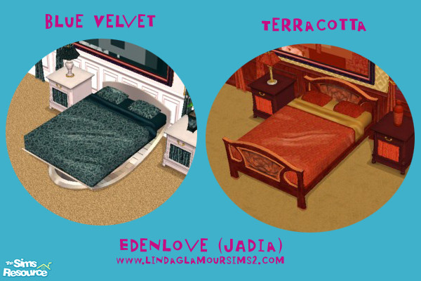 The bedding set includes 2 bedding recolors, Blue Velvet and Terracotta. They are part of larger full bedroom sets which can be found at wwww.lindaglamoursims2.com.