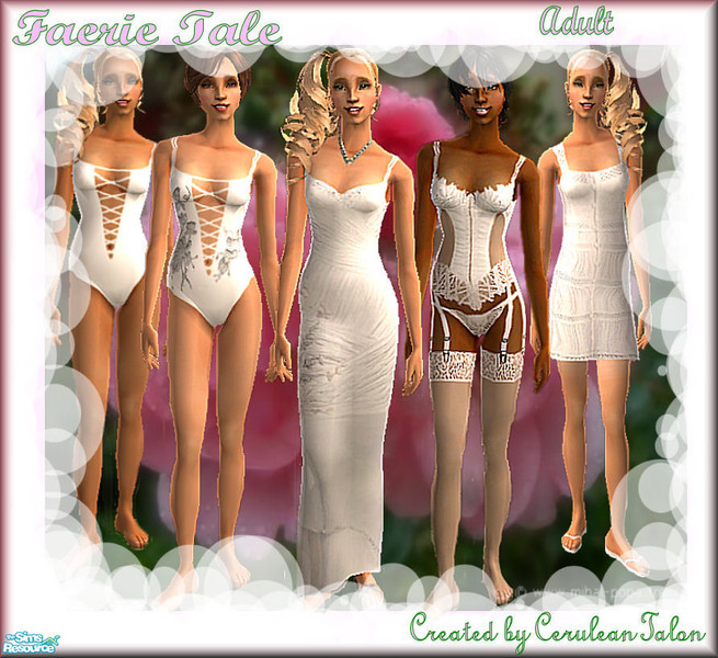 Sims can live in a magical world where luxury can be attained simply by dressing in these garments made of pure faerie spun silk, hand stitched gauzy lace, and genuine silver thread.