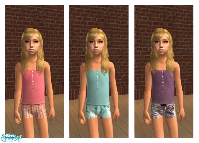 A set of three cute warm weather pjs with ribbed cami tops and sleepshorts in lovely girly colors. Maxis mesh. No expansions or stuff packs required. Enjoy!!