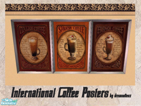 international coffee posters will brighten up your Sims diner/coffee house or perhaps your home kitchen/dining area!!