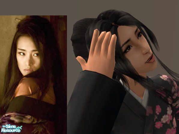 The first of three sims to come from the movie Memoirs of a Geisha. She played the hot tempered Hatsumomo, but I loved her anyway and think she is one of the most beautiful Chinese actresses out there. Hair and eyes not included, packaged with Maxis hair and outfit.
