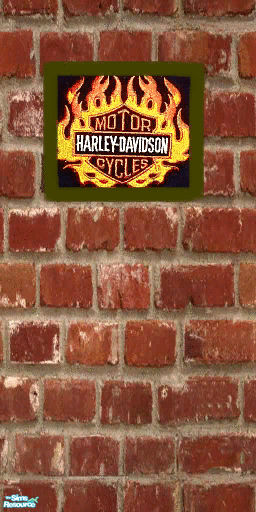 A brick wall by wyldsyde with a Harley Davidson wall hanging.
