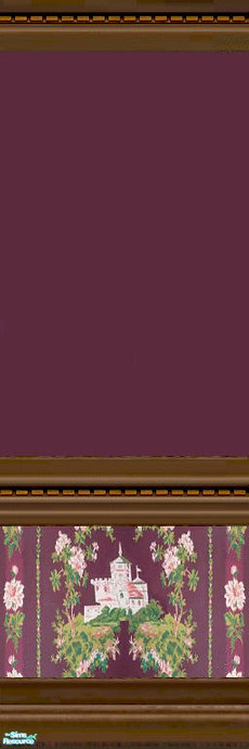 blue-grey, maroon, teal, beige and peach paint with matching wallpapers and brick. 2 floor tiles.