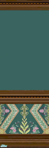 blue-grey, maroon, teal, beige and peach paint with matching wallpapers and brick. 2 floor tiles.