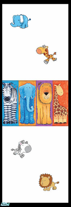 From my \'My Little Wildlife\' Bedroom Collection:- Let your Sim kids have an adventure in their own little jungle themed bedroom, complete with lions, tigers, elephants, giraffes, zebras & monkey. This is one of six walls, with a white painted background, central animal border, and baby wildlife motifs.