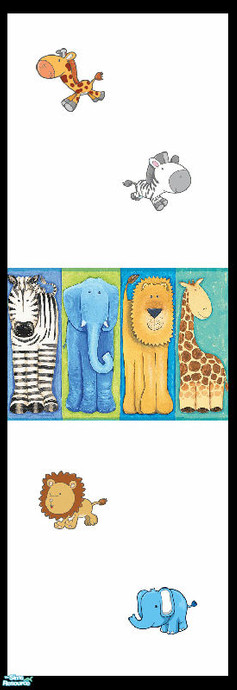 From my \'My Little Wildlife\' Bedroom Collection:- Let your Sim kids have an adventure in their own little jungle themed bedroom, complete with lions, tigers, elephants, giraffes, zebras & monkey. This is one of six walls, with a white painted background, central animal border, and baby wildlife motifs.