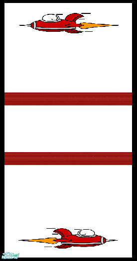 From \'My Little Starship\' Bedroom Collection: This is one of two seamless walls with a white painted background, two central rails in red, and rocket/starship motifs to match the rest of the bedroom.