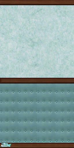 Georgeous textured plaster with light aqua paint over studded aqua dyed leather wall treatment. Dark wood chair rail and moldings.