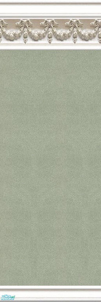 Newly revised, white, ornately carved, swagged, mouldings hold a muted and mottled green paint .