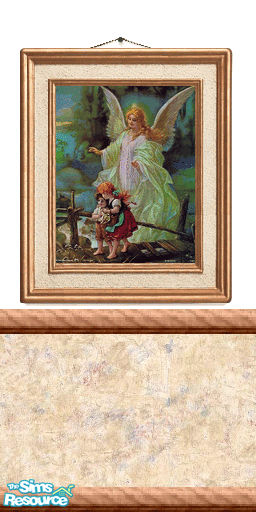 Guardian angel and two children on a white wall with chair rail, a cream, beige, blue and raspberry lower half. part of set