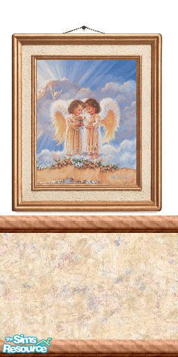 Two child angels picture on a white wall with chair rail, a cream, beige, blue and raspberry lower half. part of set