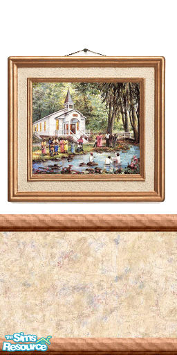 A church with an outdoor baptism picture on a white wall with chair rail, a cream, beige, blue and raspberry lower half. part of set