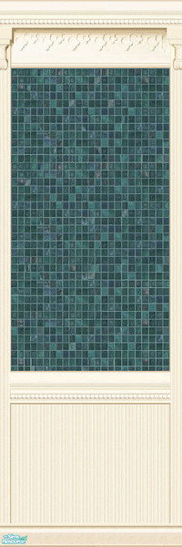 Cream colored, wainscotted, carved, and pillared panels hold various turquoise tiles. Matching seamless tiles are also included in the set.