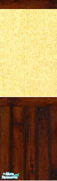 The dark cherry boards and mathing ceiling trim set\'s off the soft yellow and cream patterned wallpaper .