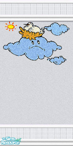 Beautiful designer walls in grey vinyl sheeting and grey tiles for kitchen or bath. Bird's nest on unhappy cloud.