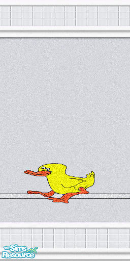 Beautiful designer walls in grey vinyl sheeting and grey tiles for kitchen or bath. Yellow duck.