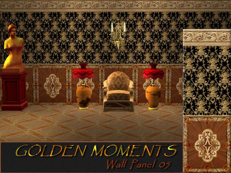 Wall panel with golden damask and black background.Wall belongs in the paneling category and cost 11.I made this wall with layers combining upper and lower border,wallpaper texture and panel on the bottom of the wall.Wall Panel 05 is part of the Golden Moments set.Enjoy.