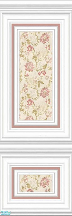 White, fully wainscotted wall panels hold wallpaper with a floral pattern done in corals, pinks, and sage green on a creamy yellow background. Matching tile and coordinating carpet are also included in this set. Always TSRAA. Please find in the Paneling category