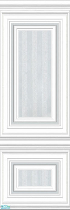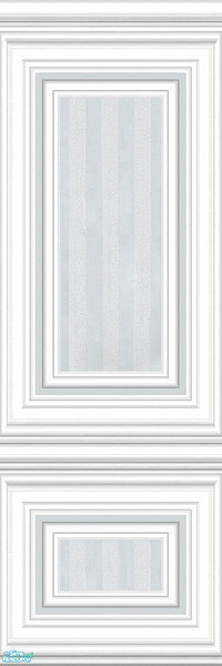 White, fully wainscotted panels hold soft, muted, blue gray stripped wallpaper panels. Two coordinating carpets are included in this set.
