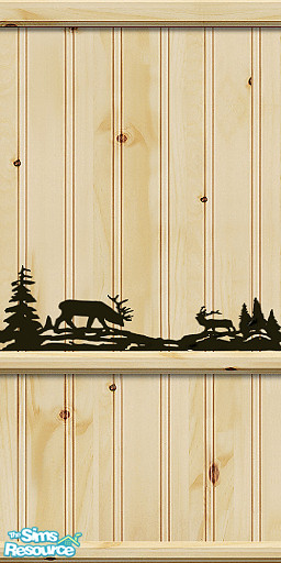 Knotty pine paneling with decorative wildlife silhouette borders.