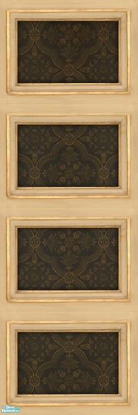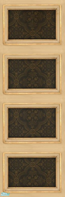A formal pattern in deep gold on a dark blue background, with moldings that match my Old Cream panels. No longer new or clean, but still beautiful.