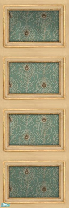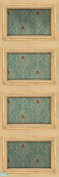 Graceful peacock feathers of brown and cream on a pale robin\'s egg blue background, with molding to match my Old Cream panels. No longer new or clean, but still beautiful.