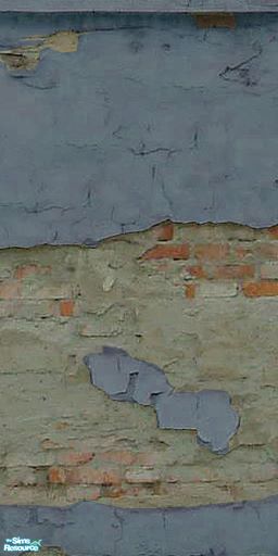 Cracked blue plaster peeling off of an underlying red brick wall. Set of eight tiles that form a continuous tiling strip.