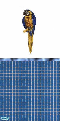 blue parrot against white wall with blue rail and small blue tiles..tsraa