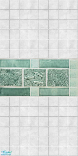 Lovely white tile wall with carved jade fish tiles. Part of the Pisces Bathroom by Riverwillows.