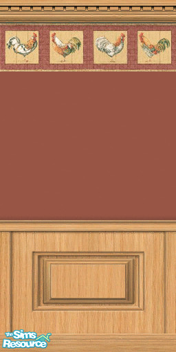 Kitchen wallpapers featuring cockerel and apple borders. main colours are red, yellow, green and brown.