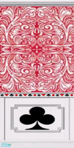 This wallpaper features a design based on the backs of Hoyle Maveric playing cards. This version has a club print in the middle of the wooden pannel, and a row of suit symbols just beneath the wallpaper.