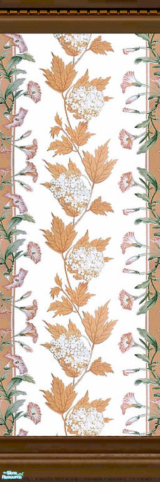 blue-grey, maroon, teal, beige and peach paint with matching wallpapers and brick. 2 floor tiles.