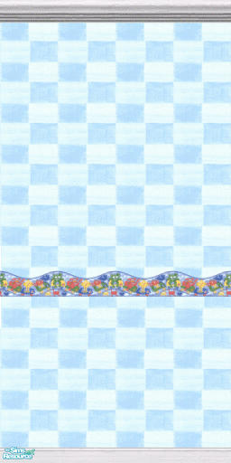 Blue Check Wallpaper with Blue Monster Border and a white base board and crown molding.